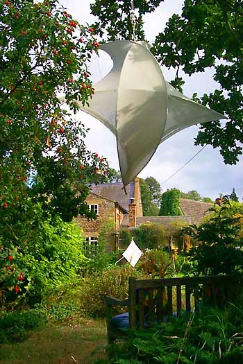 Suspended stretched textile Size – 60 x 60cms. Garden feature. Designs for shade makers and other individual requirements can be commissioned.
